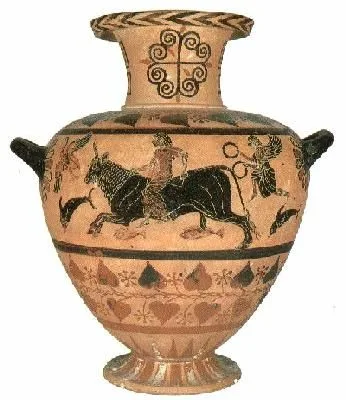 La lettura ideografica, numerologica e acrofonica  del rebus raffigurante il celeberrimo mito del ‘Ratto d’Europa’ (13), conoscendosi però certe convenzioni del system di scrittura, è assai difficile ma non impossibile. Essa che sembra tripartita, inizia dalla destra in alto con la figura alata (14) che tiene in mano quelli che sono stati definiti due ‘serti’ (due ‘corone’); quindi prosegue con il toro Zeus, che sulla groppa  sostiene Europa ed è preceduto da un volatile;  infine si completa con  la stringa segnica inferiore con le figure dei quattro (15) pesci, due guizzanti (16) e due nuotanti. Alla ideografia suddetta bisogna aggiungere però i due segni della ‘continuità’ (il motivo reiterato) all’inizio e alla fine disegnato (17) attorno ai manici, ideogrammi questi ultimi notanti la 'forza'.